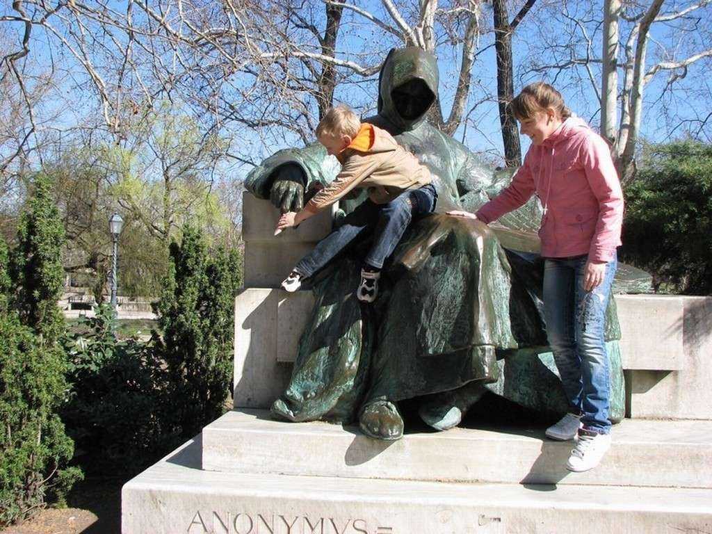 Здесь же находится памятник Анонимусу — безымянному автору древней венгерской хроники. Туристы, своими прикосновениями, натёрли до блеска его перо. Какое, интересно, желание нужно при этом загадывать? Писать без ошибок?