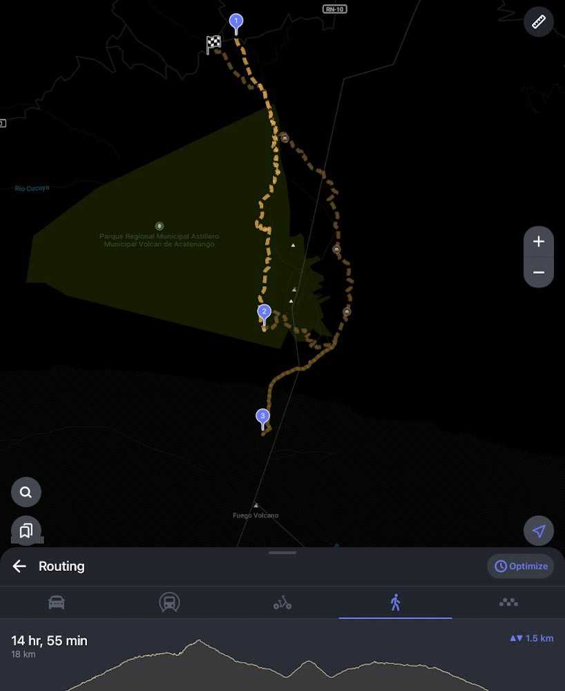 Расстояние 6 км до палаточного лагеря, 1500 м перепад высот, 5-6 часов ходьбы. Затем дополнительные 4 км, 300 метров спуск и столько же подъем до смотровой площадки Фуэго, и обратно тот же маршрут. Общее время радиального выхода — 5 часов. Получается очень сложный, но выполнимый походный день.
