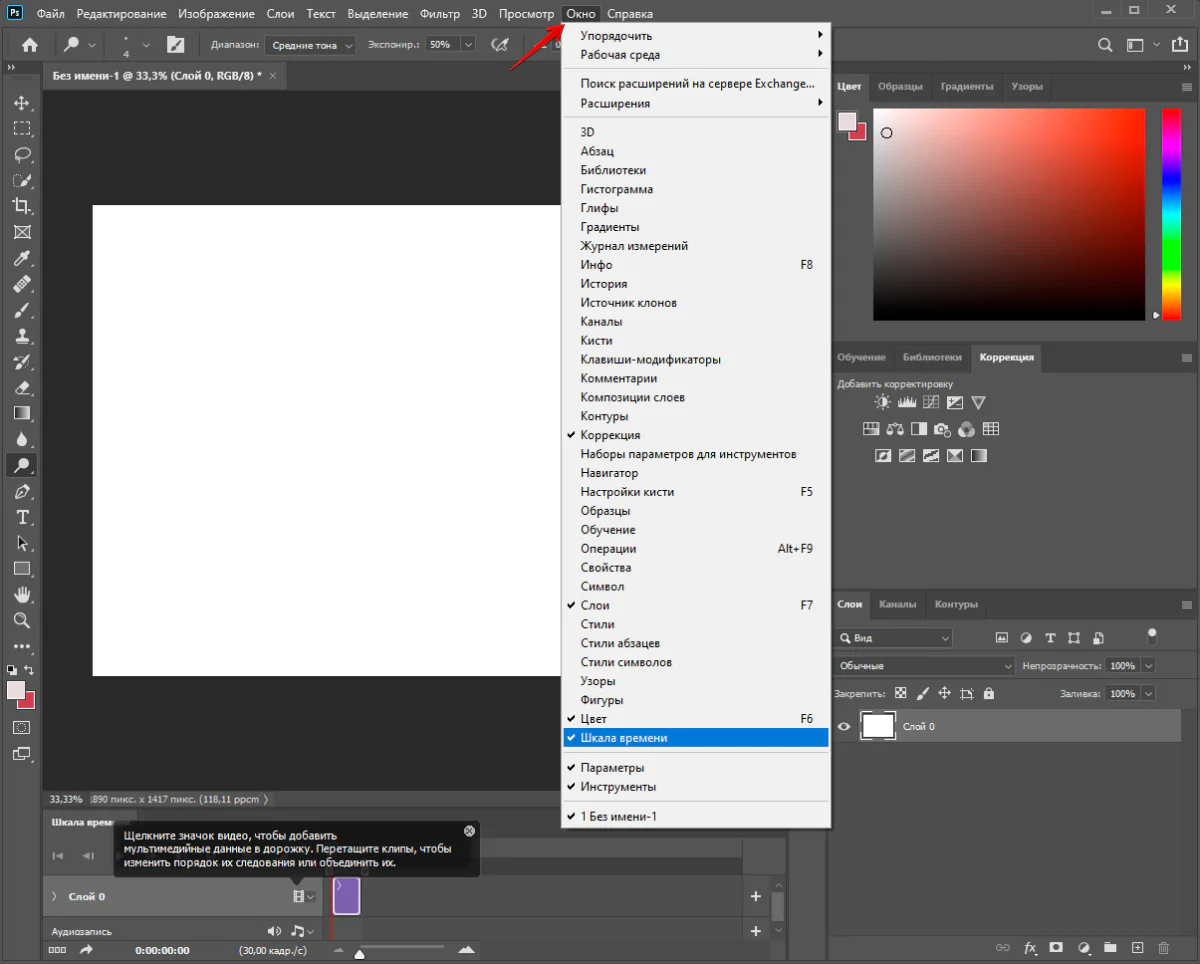Photoshop не предназначен для сложных анимированных проектов, но в нем легко работать с покадровой анимацией для создания gif-файлов. Для этого нужно выбрать «Временная шкала» в разделе «Окно» на верхней панели.