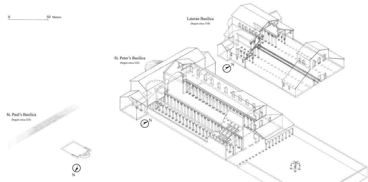 В IV веке базилика, до этого занимавшая в античном зодчестве довольно скромное место, становится излюбленным типом константиновской архитектуры. Ранние базилики были перекрыты плоской кровлей с открытым или «подшивным» деревянным потолком. Отлично сохранившийся пример — Aula Palatina в Трире (310). Первой базиликой, перекрытой каменным сводом, считается колоссальная базилика Максенция на Римском форуме (306—312 гг.).