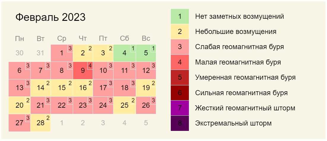 - С 22 по 23 февраля — магнитная буря силой от 3 до 4 баллов;