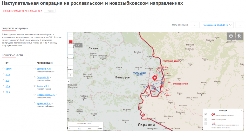 На странице https://pamyat-naroda.ru/ops/ вы можете ознакомиться с планами 226 операций с подробными схемами на карте. Каждая страница об операции содержит фамилии командующих и номера воинских частей, а также описание результата операции.
