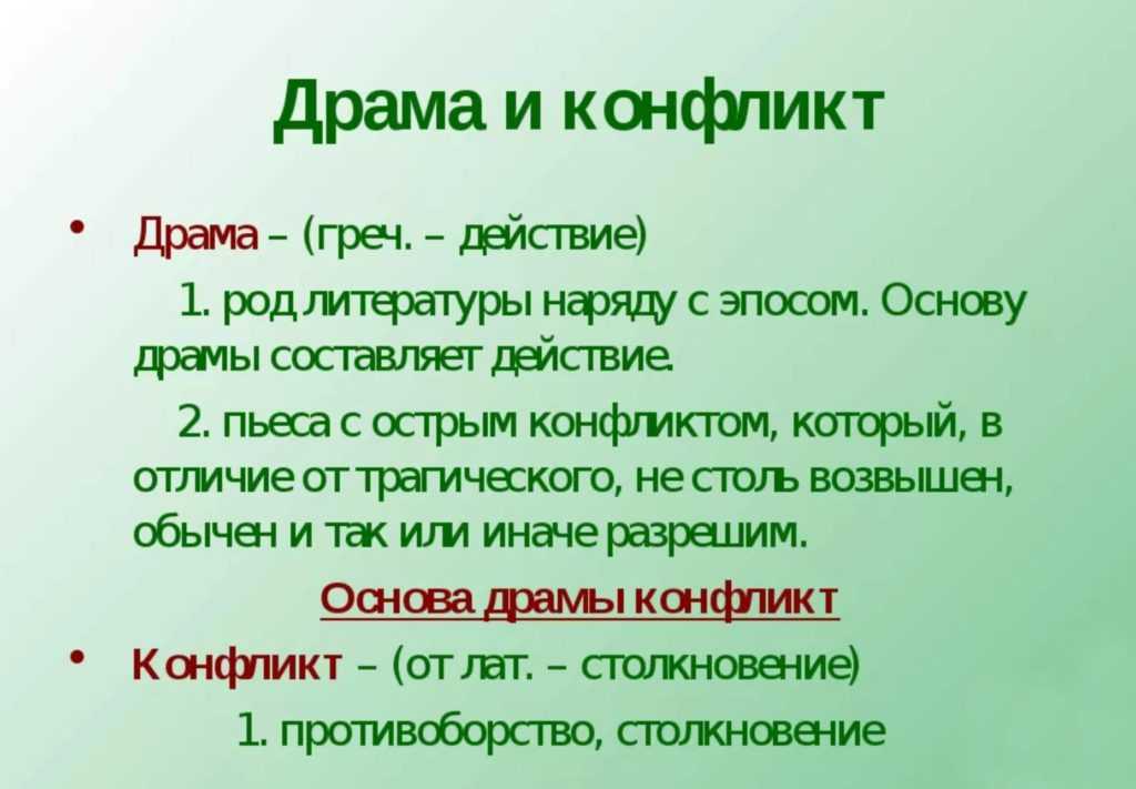 Драма – это литературное произведение, изображающее серьезный конфликт между действующими лицами или между действующими лицами и обществом. Отношения между героями (героями и обществом) сочинениями этого жанра всегда полны драматизма. По ходу развития сюжета идет напряженная борьба как внутри отдельных персонажей, так и между ними.