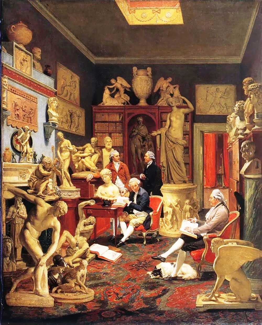 Таунли непринужденно беседует с тремя друзьями: хранителем Британского музея Томасом Астлом, французским антикваром Пьером д’Анкарвилем и политиком Чарльзом Гревилем. Ведущей темой британского искусства последней трети XVIII века была Античность, археологические раскопки вызывали ажиотаж, аристократию обуяла страсть коллекционирования. Картина Цоффани — написанный красками достоверный документ эпохи.