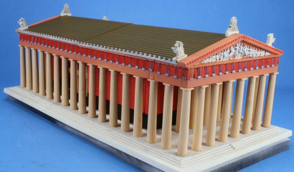 Размеры прямоугольной основы – 69,5 на 30,9 метра. На фасадах здания по 8 колонн, по бокам – по 17. Высота возведенного храма 14 метров. Первоначально Парфенон был раскрашен, нижняя поверхность красным цветом, кессоны колоннады – синим и золотистым.