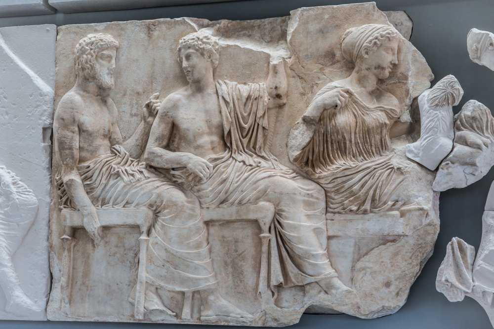 Обогнув Парфенон, процессия подходила к фронтону, где на троне торжественно восседал Зевс. Около громовержца – кузнец Гефест, который только что рассек череп Владыке Богов. Из него появилась богиня Афина в доспехах и шлеме с атрибутом мудрости – змеёй.