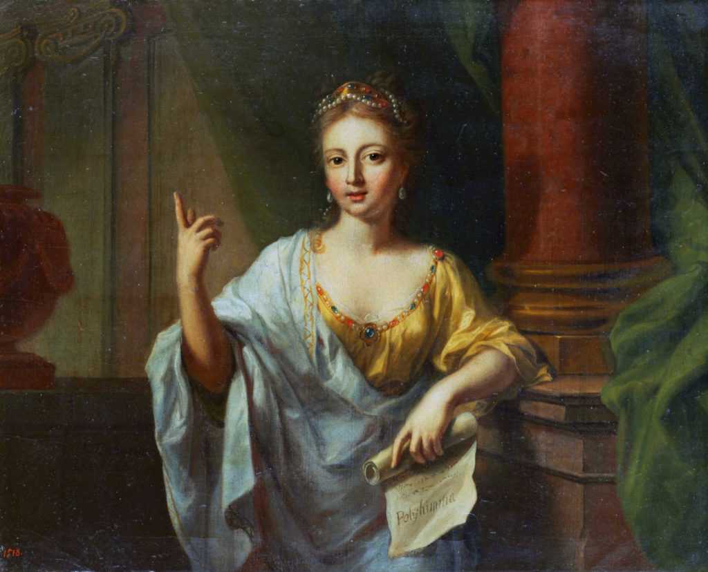 Она держит в руках эти письменные принадлежности, демонстрируя приверженность философии, науке и поэзии. Иногда в изображениях божественной вдохновительницы появляется музыкальный инструмент — арфа. В скульптурах мастера помещают в ее руки флейту.