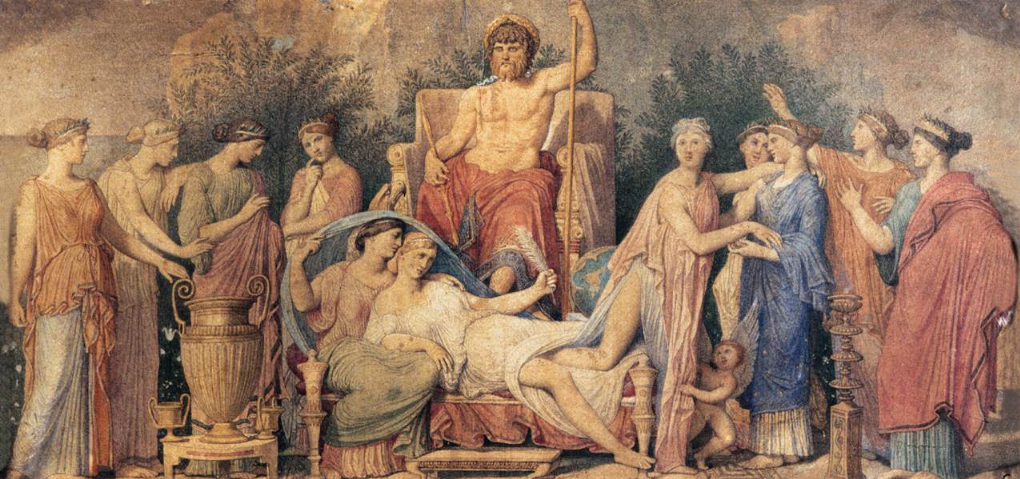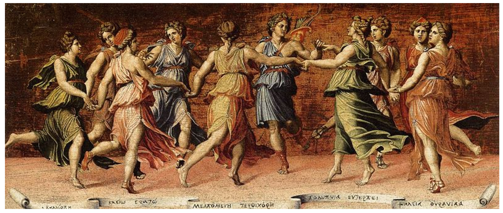 Согласно классической греческой мифологии у верховного бога Зевса и Мнемозины, дочери титанов Урана и Геи, родились девять дочерей. Так как Мнемозина была богиней памяти, неудивительно, что её дочери стали назваться музами, в переводе с греческого это означает «мыслящие».Предполагалось, что излюбленным местом обитания муз служили горы Парнас и Геликон, где в тенистых рощах, под звук прозрачных источников, они составляли свиту Аполлона. Под звук его лиры они пели и танцевали.