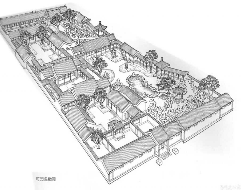 Вдоль перпендикулярных улиц строились прямоугольные дворы сыхэюань. Двор по периметру окружали жилые посещения, фасады которых выходили во внутрь. На улицу смотрели лишь маленькие окна, либо глухая стена. Жизнь семьи была полностью скрыта от посторонних глаз. Такая планировка домов существовала в Китае с 11-8 веков до нашей эры.