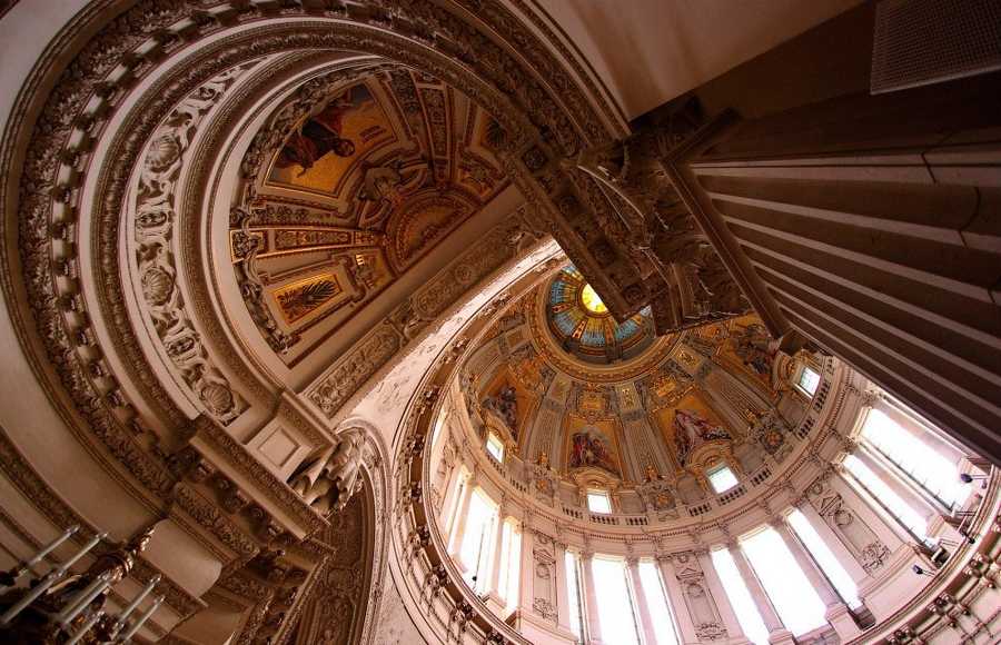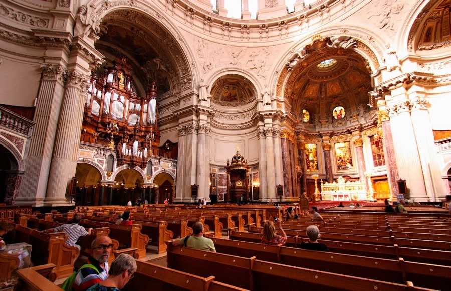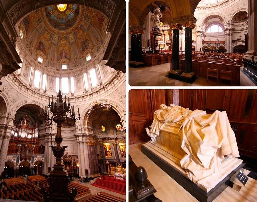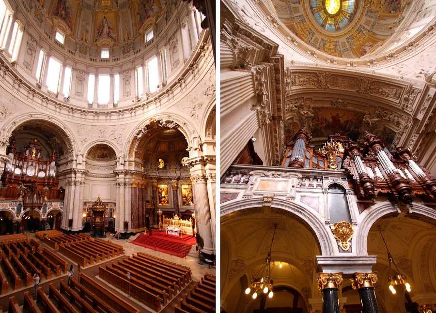 Берлинский кафедральный собор — самая большая протестантская церковь Германии, выполнен в стиле барокко и строился 11 лет, с 1894 по 1905 год. Внутри собор впечатляет так же, как и снаружи.