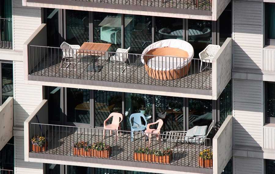 Балкончики какого-то дома напротив — с креслами, столами и лежаками. Лежать и загорать: