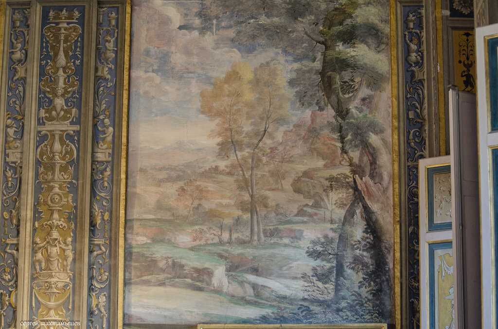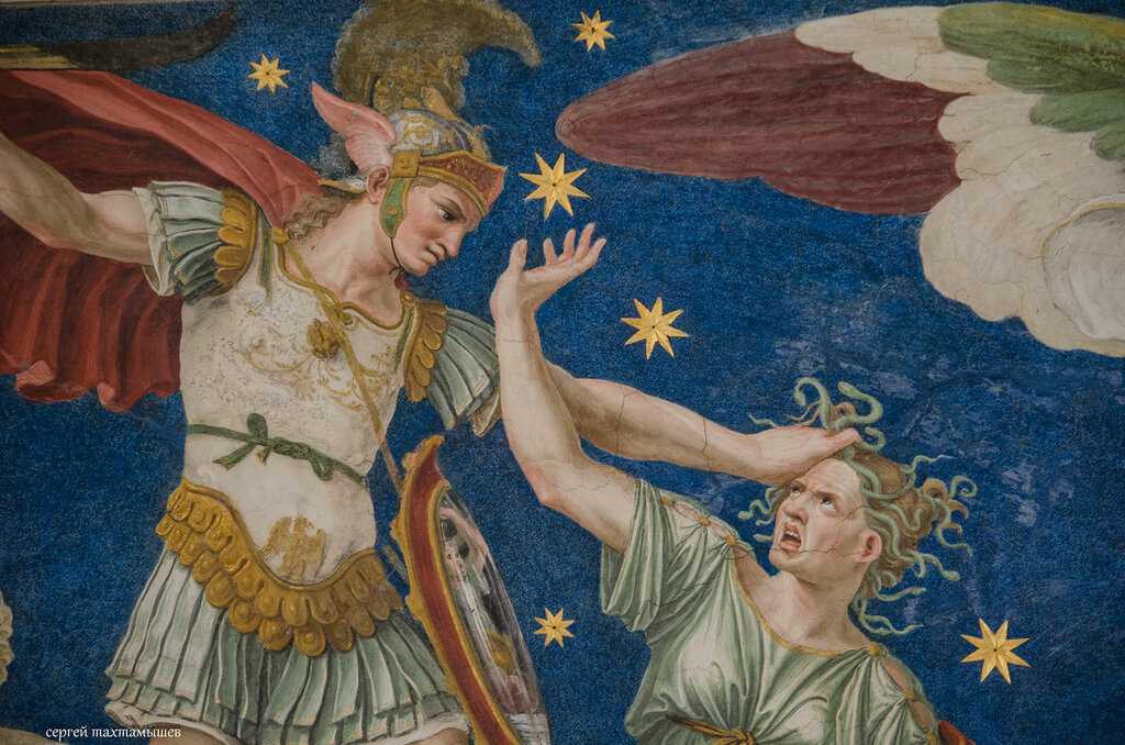 Мифологические фигуры на потолке представляют собой созвездия в том порядке, в котором они встали в астрологическом гороскопе хозяина, родившегося 1 декабря 1466 года.