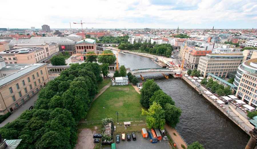 Если присмотреться, она почти по центру картинки, где-то там, далеко. Речка Шпрее огибает Музейный остров: