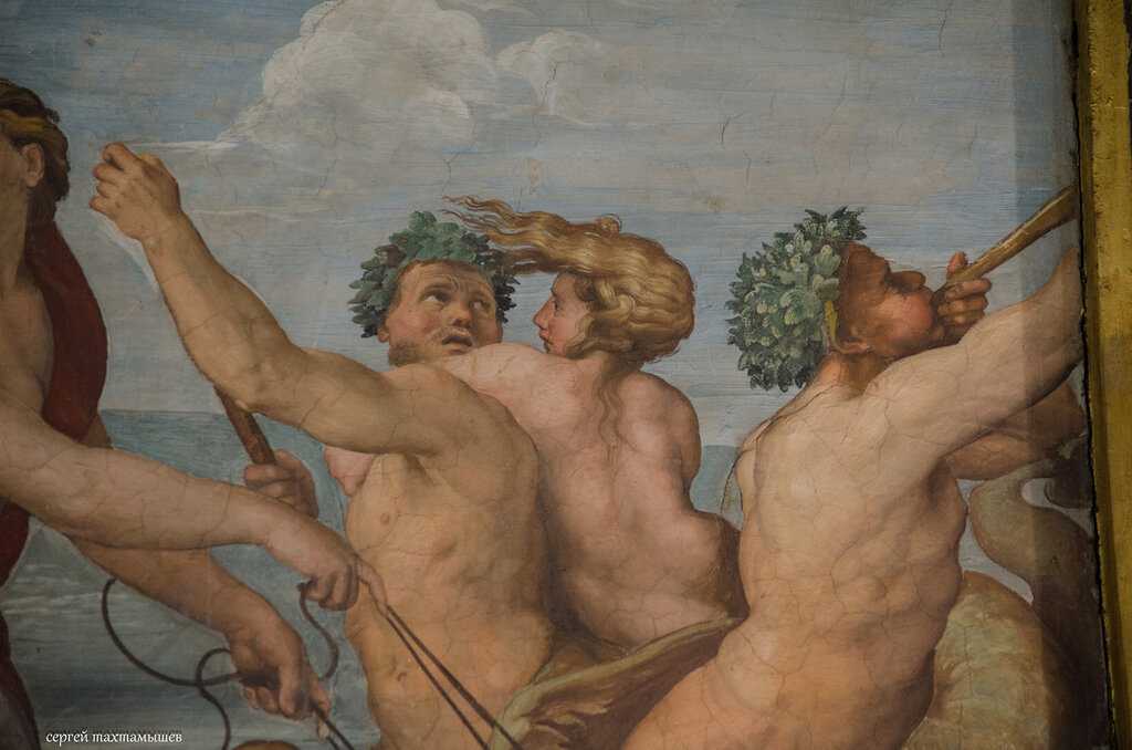 Колесница Галатеи состоит из гигантских раковин. Они похожи на те раковины, из которых рождается Венера на знаменитом полотне Боттичелли. Правда, свою повозку Рафаэль снабдил еще миниатюрными колесами с лопастями. Слева изображен мощный Тритон (получеловек-полурыба), который бесцеремонно хватает морскую нимфу. Позади него, верхом на лошади, сидит еще один Тритон, трубящий, как в рог, в морскую раковину. Справа расположены три фигуры, в которых сочетаются черты людей, лошадей и рыб. Рафаэль создавал свою фреску по поэме, написанной в XV веке поэтом Полициано, однако позволял себе вольности в некоторых деталях.Два дельфина, везущих колесницу Галатеи, выглядят очень свирепыми созданиями. Вероятнее всего, Рафаэль никогда не видел живого дельфина.