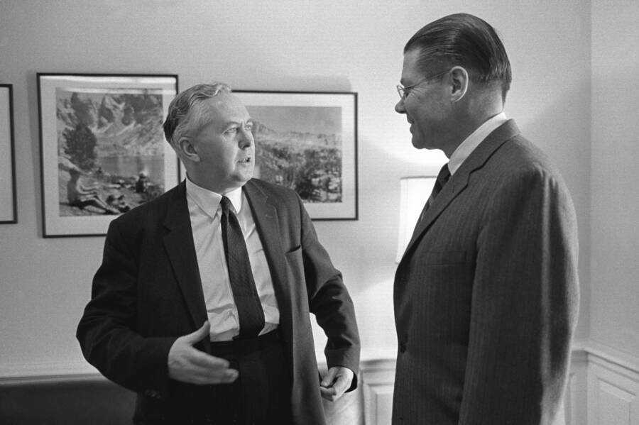 Wikimedia Commons Сэр Гарольд Уилсон встречается с министром обороны Робертом С. Макнамарой (справа) в Пентагоне.