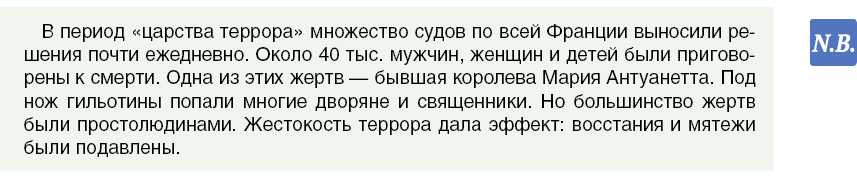 Робеспьер возглавил Комитет общественного спасения, получивший почти диктаторские полномочия. Он развязал жесткую кампанию против тех, кого считал врагами Франции. Эта кампания, известная как якобинская диктатура, или «царство террора», продолжалась с июля 1793 г. по июль 1794 г. Принятие конституции 1793 г. откладывалось. Конвент оставался средоточием законодательной власти. Он же осуществлял и исполнительную власть через комитеты и комиссаров — членов Конвента, наделенных широчайшими полномочиями.