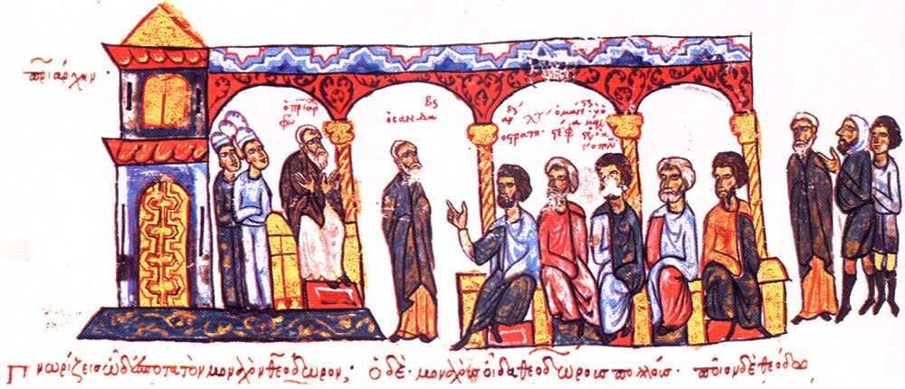 Допрос Фотия. Иллюстрация из рукописи «Обозрения истории». (wikimedia.org)