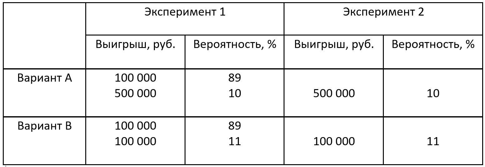 - Вариант С: 10% шансов выиграть 5 миллионов франков, 90% вероятности не выиграть ничего.