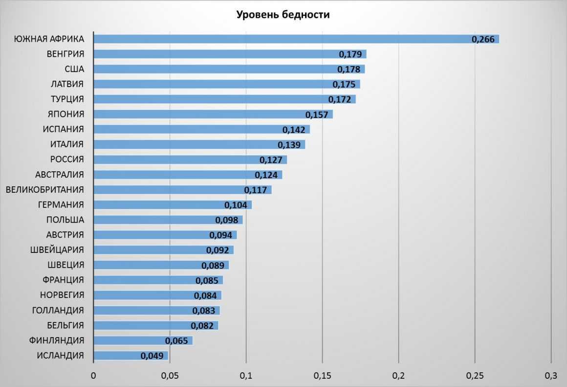 С наивысшим уровнем бедности сталкиваются страны: ЮАР, Венгрия, США (как ни удивительно – но здесь нужно учитывать уровень эмигрантов в стране), Латвия, Турция, Япония. Россия в этом рейтинге занимает 9-е место.