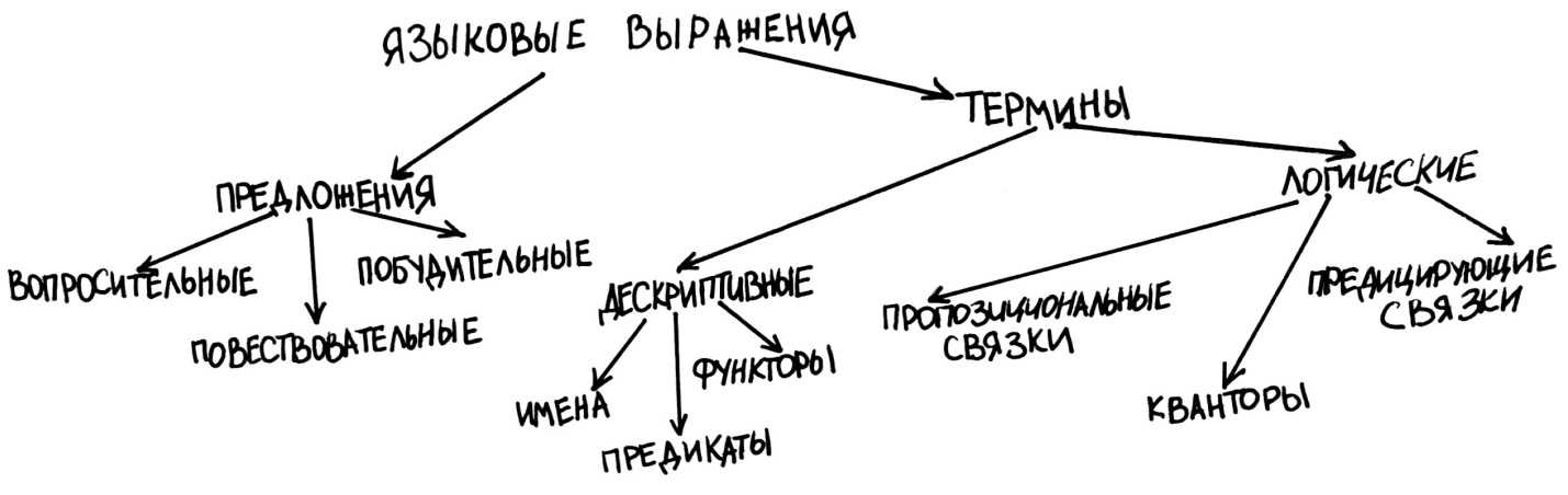 Расшифруем, что это всё обозначает. Итак, языковые выражения делятся на два типа: предложения и термины.