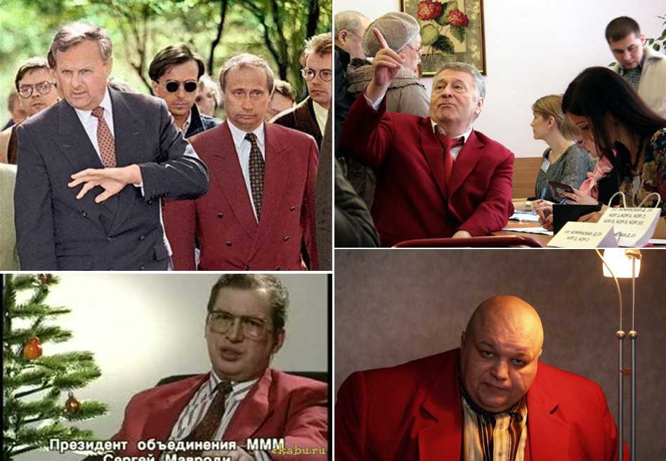 Удивительно, но в своей любви к этим пиджакам новые русские оказались на острие модной атаки. В 1992-м Versace представил на Парижской неделе новую коллекцию, где был и малиновый пиджак. Вскоре их стали носить в России. Есть несколько версий того, кто несет ответственность за моду на Raspberry Jackets. По одной из них, это основатель финансовой пирамиды МММ Сергей Мавроди, по другой — участники игры «Что? Где? Когда?». Сначала малиновыми пиджаками увлеклись богатые русские, затем, в середине 90-х, пиджаки перешли в разряд ширпотреба (как бы сейчас сказали, масс-маркета). Их носили студенты, мелкие коммерсанты, просто гопники. Малиновый пиджак был в тренде до кризиса 1998-го, а потом бесследно сгинул.
