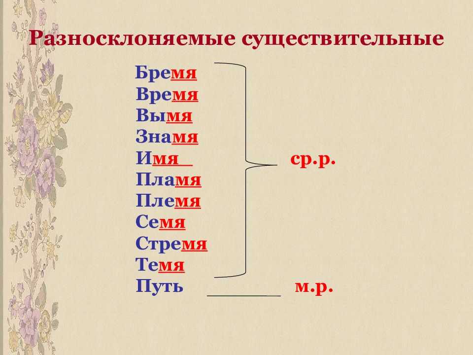- Существительные на –мя (имя, вымя, пламя, семя и др.), как и лексема «путь», относятся к разносклоняемым. Это значит, что они совмещают признаки разных типов склонений: новым путем, быть в пути, с семенем, о бремени.