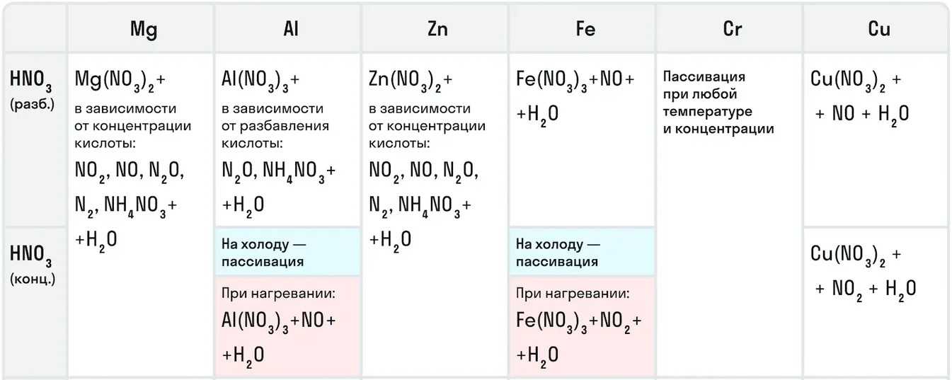 Например, с металлами данная кислота никогда не будет реагировать с выделением газообразного водорода. Рассмотрим таблицу с примерами металлов с различными концентрациями азотной кислоты: