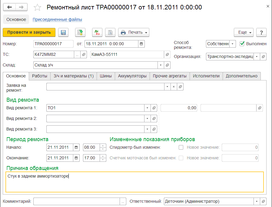 Нужно обратить внимание, что в подсистеме ведется учет ремонтных работ, проведенных на собственной ремонтной базе или в сторонних сервисных центрах.