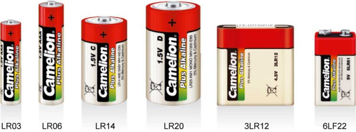Щелочные батарейки (LR). Имеют катод из цинка, анод из диоксида марганца и электролит из гидроксида щелочного металла. Они имеют напряжение 1,5 вольта, увеличенную емкость, низкий саморазряд и большой срок хранения до 10 лет. Они сохраняют работоспособность при низких температурах до -20 градусов.