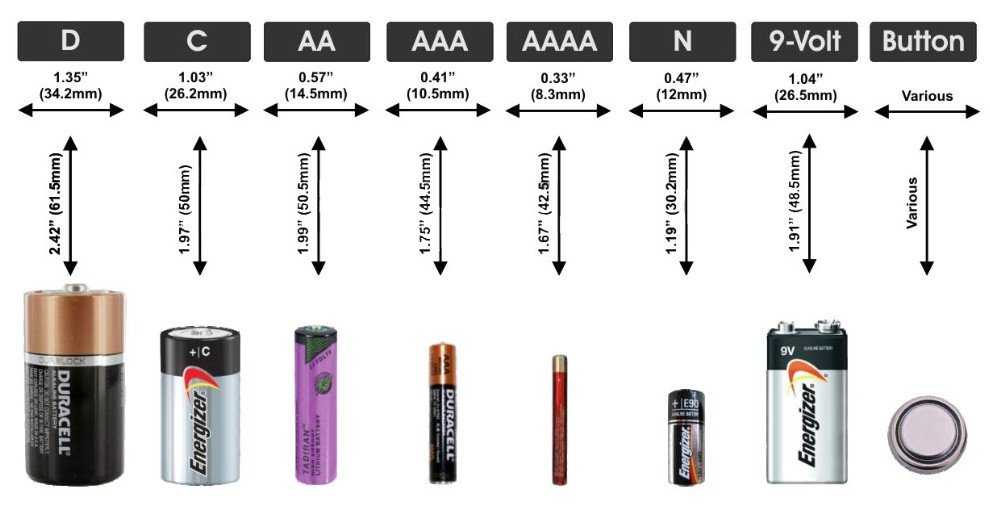 Ниже приведена таблица в которой отображаются источники энергии по типоразмеру. Она поможет определить тип батарейки.