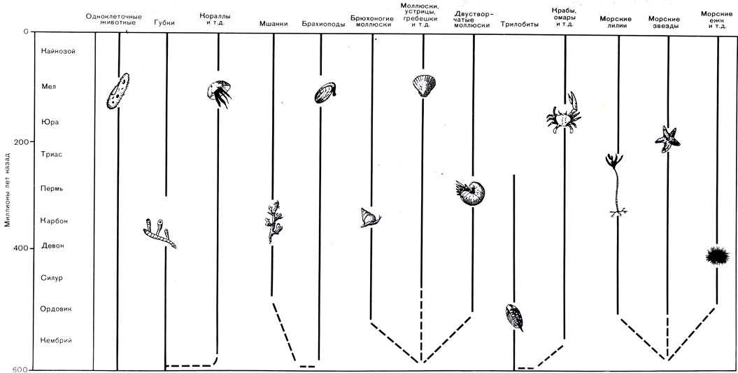 Рис. 40. Основные группы морских беспозвоночных и их положение на геологической шкале. Пунктирными линиями показаны вероятные эволюционные связи между некоторыми группами