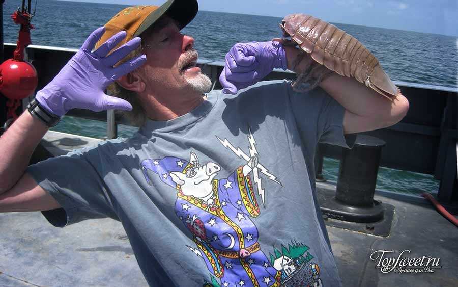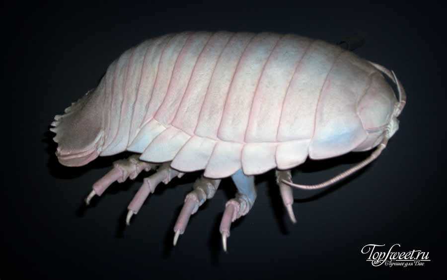 Эти животные, похожие на мокриц, обитают глубоко под водой. Их можно встретить на дне океанов на глубине от 200 до 2000 метров. Гигантский изопод может достигать размеров до 60 см. в длину.