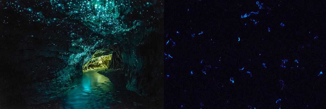 Рисунок 1. Слева: Свечение мушек Arachnocampa luminosa в австралийской пещере. Структура люциферина этих насекомых до сих пор не установлена. Справа: Светящиеся черви Fridericia heliota на поверхности почвы в сибирской тайге. Открытый нами люциферин этих олигохет стал восьмым в ряду известных науке люциферинов, завершив 25-летний перерыв в установлении новых механизмов биолюминесценции в живой природе.