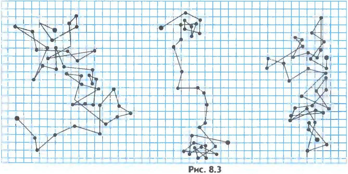 Броуновское движение — тепловое движение, и оно не может прекратиться. С увеличением температуры интенсивность его растет. На рисунке 8.3 приведена схема движения броуновских частиц. Положения частиц, отмеченные точками, определены через равные промежутки времени — 30 с. Эти точки соединены прямыми линиями. В действительности траектория частиц гораздо сложнее.