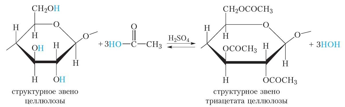 Макромолекулы целлюлозы содержат гидроксильные группы, поэтому целлюлоза проявляет свойства, характерные для спиртов. Например, целлюлоза образует сложные эфиры при взаимодействии с уксусной кислотой (уравнение реакции приведено для одного структурного звена макромолекулы целлюлозы):
