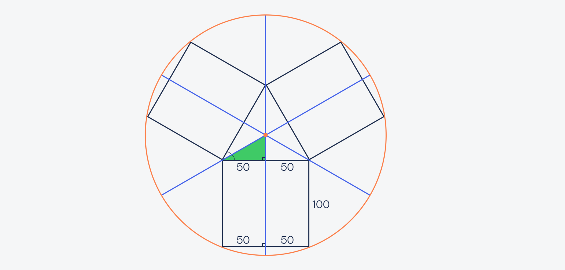 Мы уже знаем, что синие линии делят квадраты пополам, а значит, нижняя сторона треугольника равна 50 метрам. Также мы знаем, что внизу у нас прямой угол, а значит, зелёная сторона треугольника тоже равна 100 метрам: