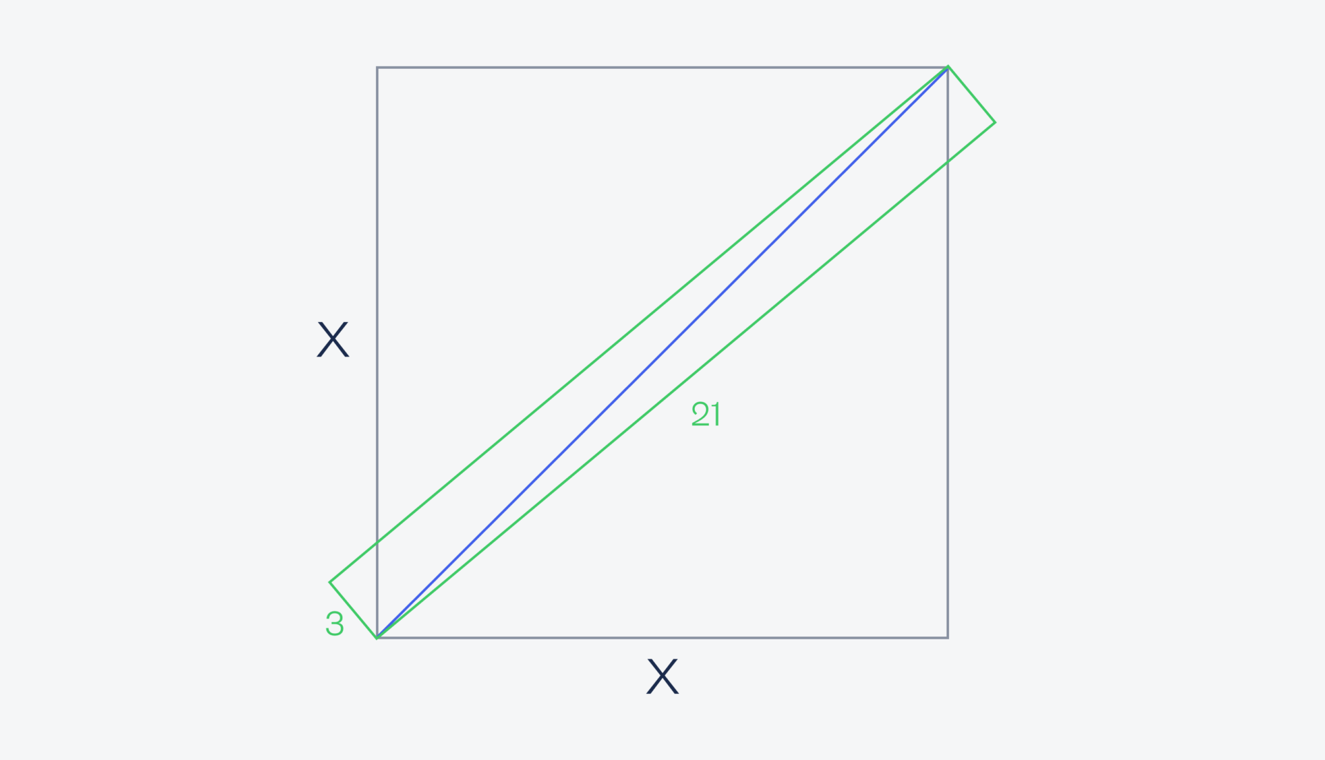 А теперь важное замечание: так как углы прямоугольника совпадают с углами квадрата, то диагональ прямоугольника — это диагональ квадрата и их длины равны. По теореме Пифагора a² + b² = c² найдём диагональ:. 21² + 3³ = с² → 441 + 9 = с² → с² = 450