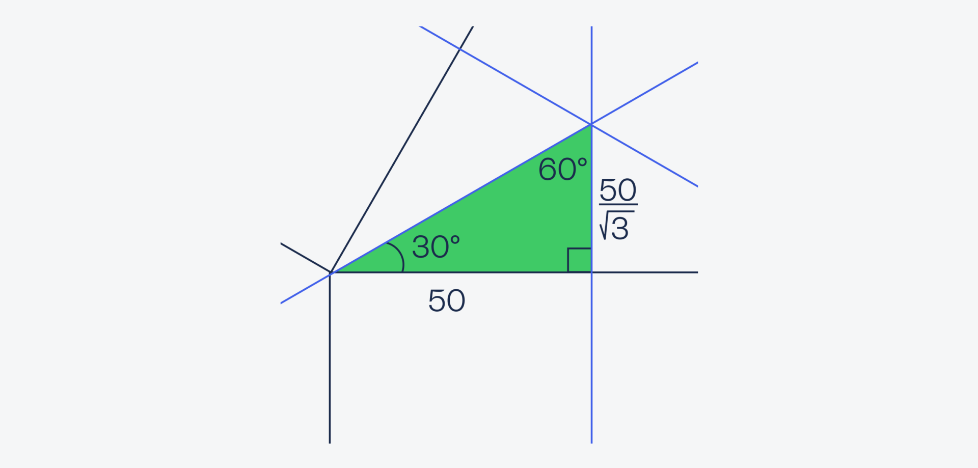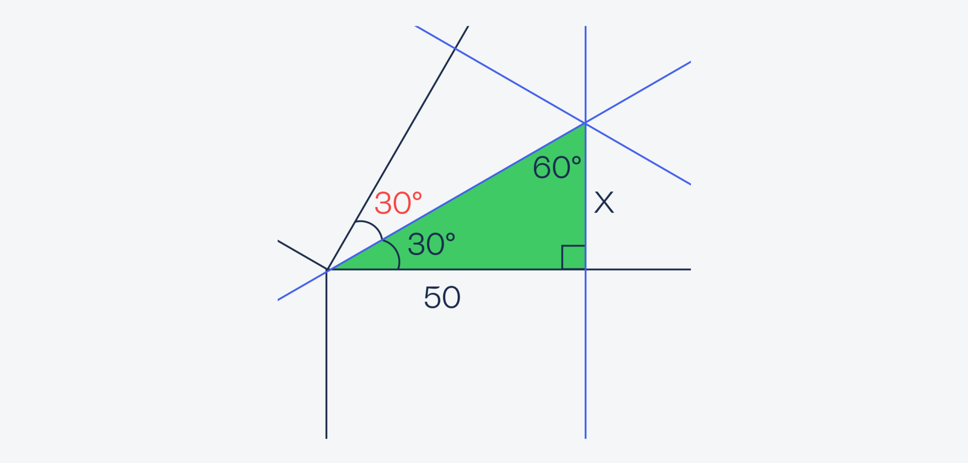 Зная всё это, найдём длину короткого катета по формуле X = tg(30) × 50 = 1/√3 × 50 = 50/√3