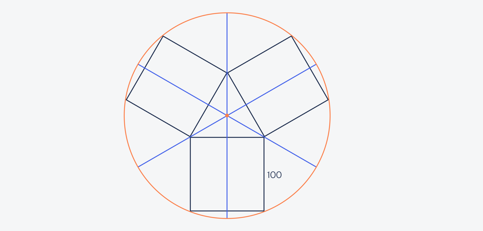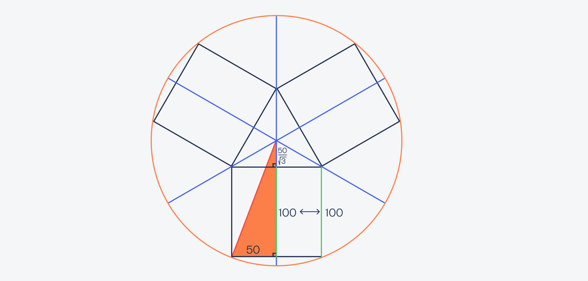 Первым делом проведём через круг три диаметра, каждый из которых будет проходить через вершину треугольника. Длина каждой стороны треугольника — тоже 100 метров, так как он образован сторонами квадрата: