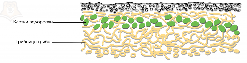 В таком сожительстве водоросль синтезирует органические вещества для питания гриба, поэтому её клетки преимущественно располагаются в верхних слоях тела. Грибные гифы, в свою очередь, всасывают воду и минеральные вещества из субстрата и поставляют их растительным клеткам. Как и в случае с грибами-симбионтами, водоросли и грибы сотрудничают на взаимовыгодных условиях.