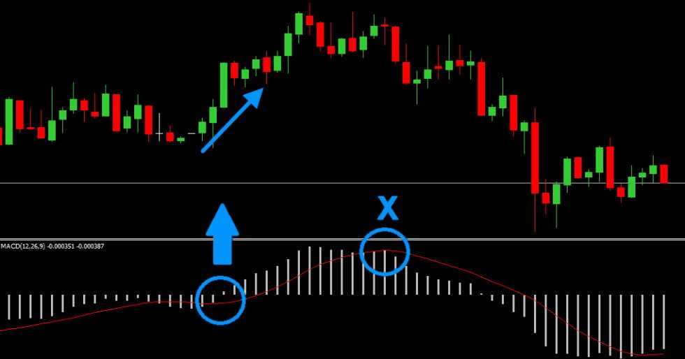 Располагается под графиком в виде гистограммы (на сером фоне) и сигнальной линии (красная).