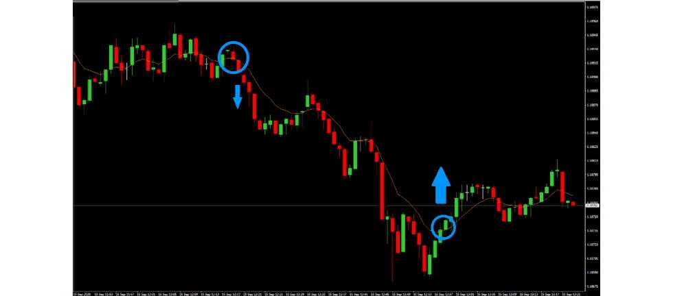 - При нисходящем тренде график пересекает скользящую среднюю сверху вниз.