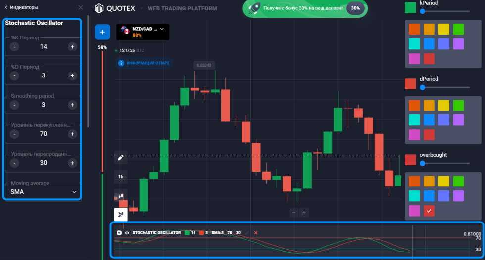 - Период кривой %D – период сигнальной кривой осциллятора, это МА от кривой %К.