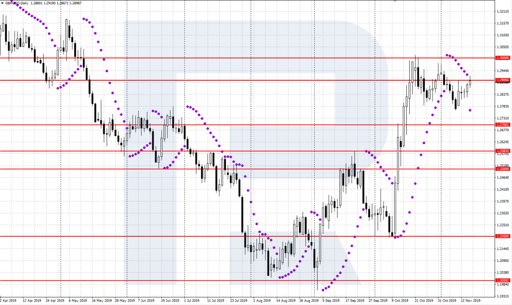 Индикатор Параболик отображается в виде группы точек, нанесенных на график цены. Если график цены находится ниже точек Параболика, считается, что тенденция нисходящая, если цена выше точек – тенденция восходящая. Можно использовать точки Параболика как ориентир для стопов. Если открыта позиция по тренду, можно постепенно переносить стоп вслед за движением цены по точкам форекс индикатора, пока тренд не развернется и позиция не закроется.