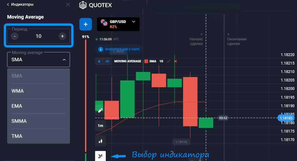 Для выбора индикатора на платформе Квотекс переходим в инструменты в нижней левой части живого графика и выбираем индикатор для бинарных опционов Moving Average. Настройки по умолчанию: Период 10, скользящая SMA. На графике отображается в виде красной кривой в поле движения цены.