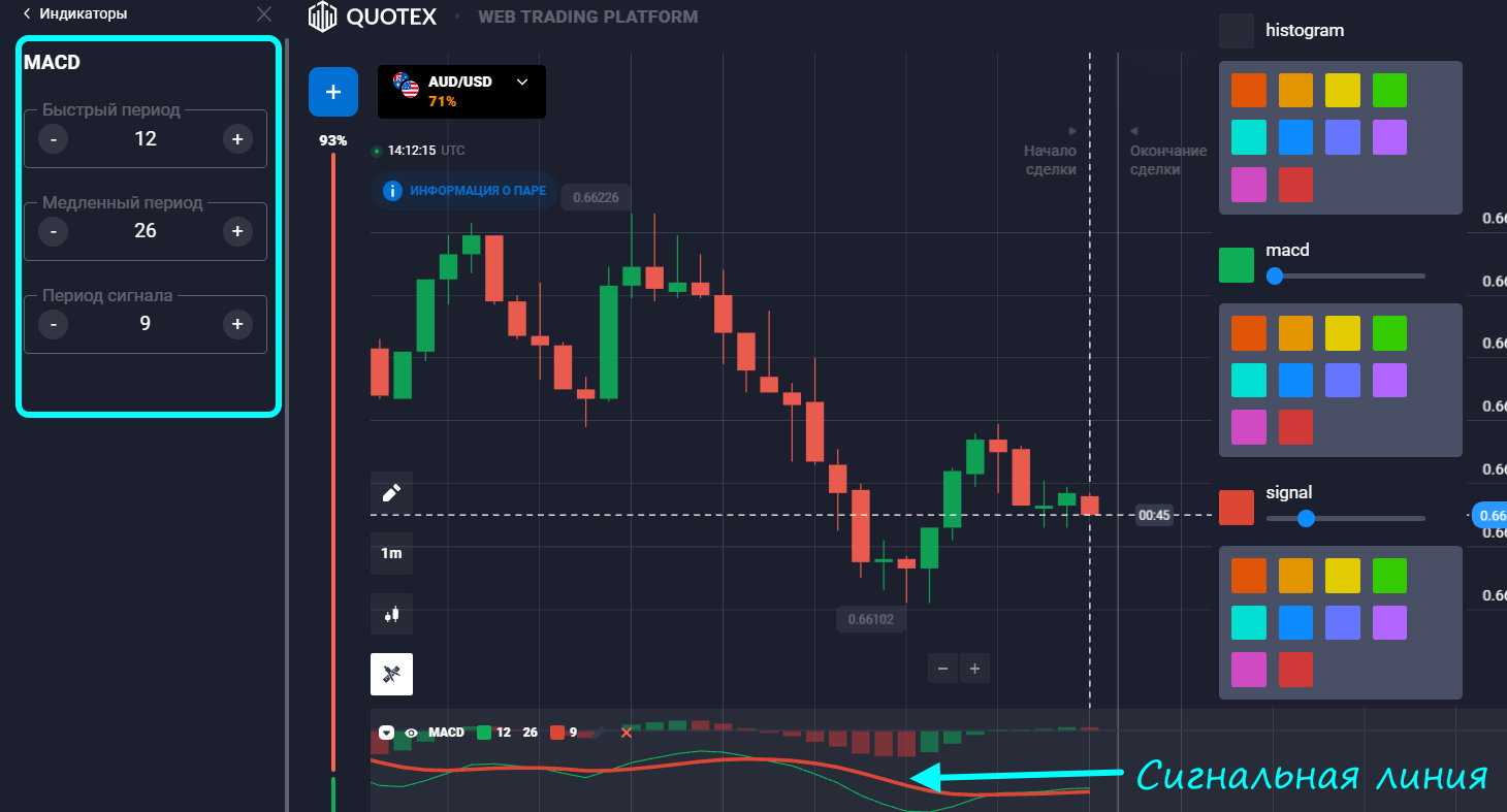 Цель индикатора MACD в бинарных опционах — определить возникающие тенденции. Индикатор состоит из двух экспоненциальных скользящих средних и одной простой скользящей средней с периодом по умолчанию, установленным на 9.