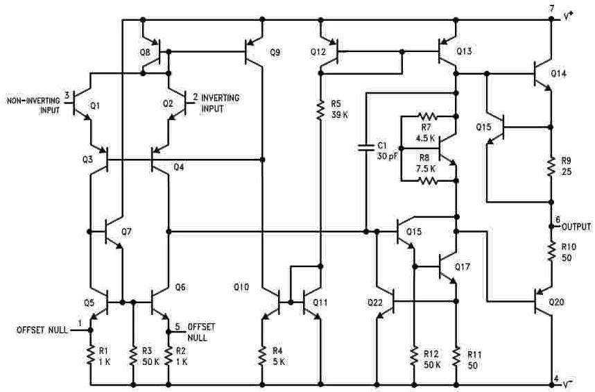 Внутренняя схема простого операционного усилителя К140УД7 (LM741)