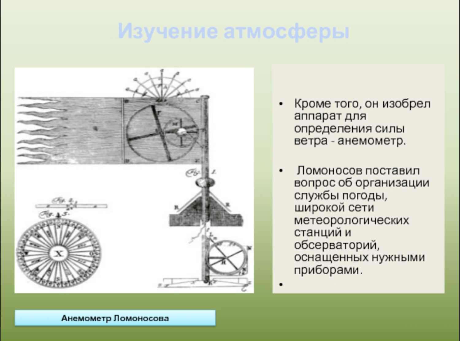 Ученый увлекался изучением атмосферного электричества и прочих климатических явлений. Благодаря этому он придумал один из прототипов современного вертолета. По задумке ученого, этот аппарат служил для того, чтобы перемещать метеорологические устройства на нужную высоту. Свое изобретение Ломоносов назвал аэродинамической машиной.