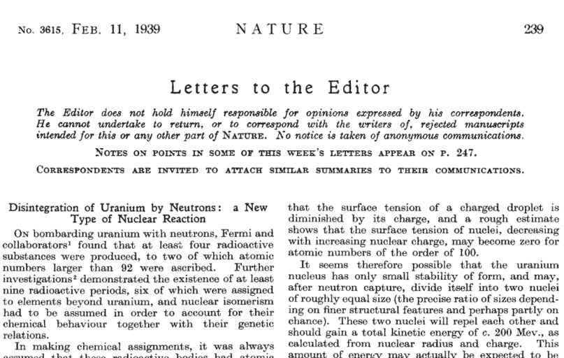 - Meitner L., Frisch O.R. Disintegration of Uranium by Neutrons: a New Type of Nuclear Reaction // Nature. — 1939. — Vol. 143. — P. 239—240. — doi:10.1038/143239a0.