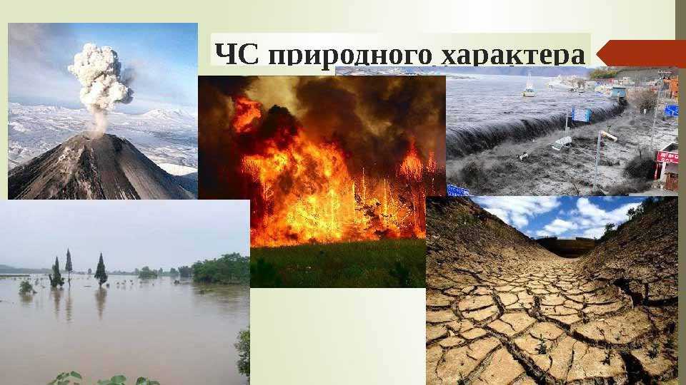 Метеорологические: Ураганы, бури, смерчи, паводок, половодье, жара, засуха Геологические: землетрясение, оползни, извержения вулканов Биологические: природные пожары, эпидемии